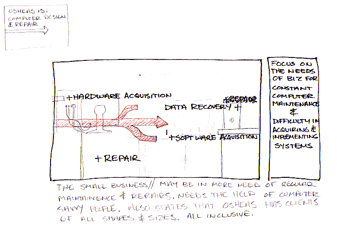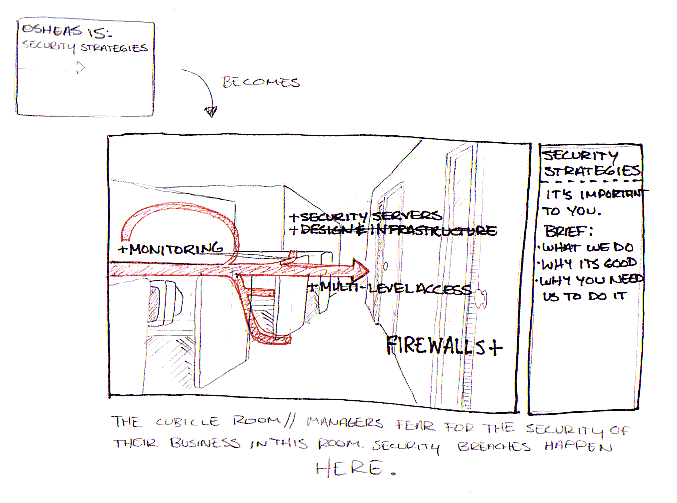 This is will be replaced by a picture of an office space. The customers office space, or at least one that looks very much like their own. Within this space, we will point out areas that Osheas services. Meanwhile, to the right of the picture we will have a brief text that summarizes the services of that category and why it is pertinent to the customer. We let it sit for a moment to let the viewr read and absorb and we move on to the next category in the same manner. This process loops through each category until we reach the end. The last photo is an image of the office and desk of a manager, ceo, president, etc. The end frame points out phone contact and email contact. The text to the right is a summary of all services and a prompt to contact Osheas.