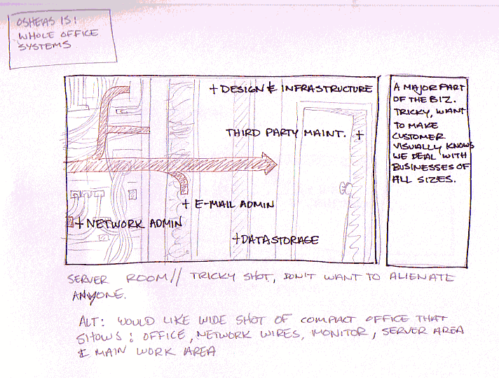 This is will be replaced by a picture of an office space. The customers office space, or at least one that looks very much like their own. Within this space, we will point out areas that Osheas services. Meanwhile, to the right of the picture we will have a brief text that summarizes the services of that category and why it is pertinent to the customer. We let it sit for a moment to let the viewr read and absorb and we move on to the next category in the same manner. This process loops through each category until we reach the end. The last photo is an image of the office and desk of a manager, ceo, president, etc. The end frame points out phone contact and email contact. The text to the right is a summary of all services and a prompt to contact Osheas.